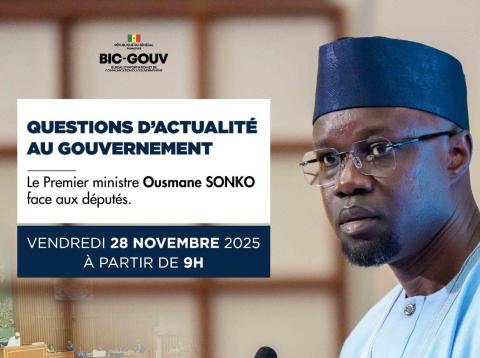 Questions d'actualité au Gouvernement avec le Premier Ministre Monsieur Ousmane SONKO. Suivez en direct la séance en cliquant sur le lien suivant : LIEN DIRECT SEANCE DE QUESTIONS D'ACTUALITE AU GOUVERNEMENT